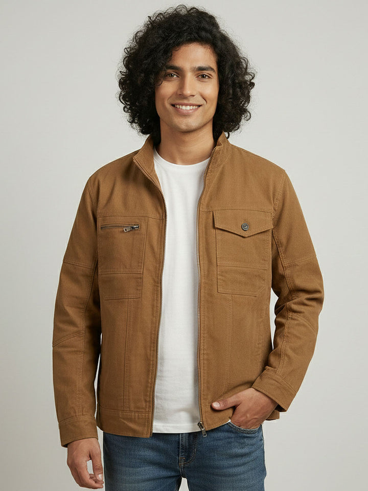 This is a stylish Men's Casual Biker Jacket in a warm Caramel Brown. It features a classic shirt collar and a full metallic zipper front closure. The jacket includes asymmetrical chest pockets: a functional single zipper pocket on one side and a single double-flap pocket secured by a metallic shank button on the other. It also has a lower bone pocket, and the cuffs use metallic shank buttons. An adjustable belt is included on the back for a tailored fit.