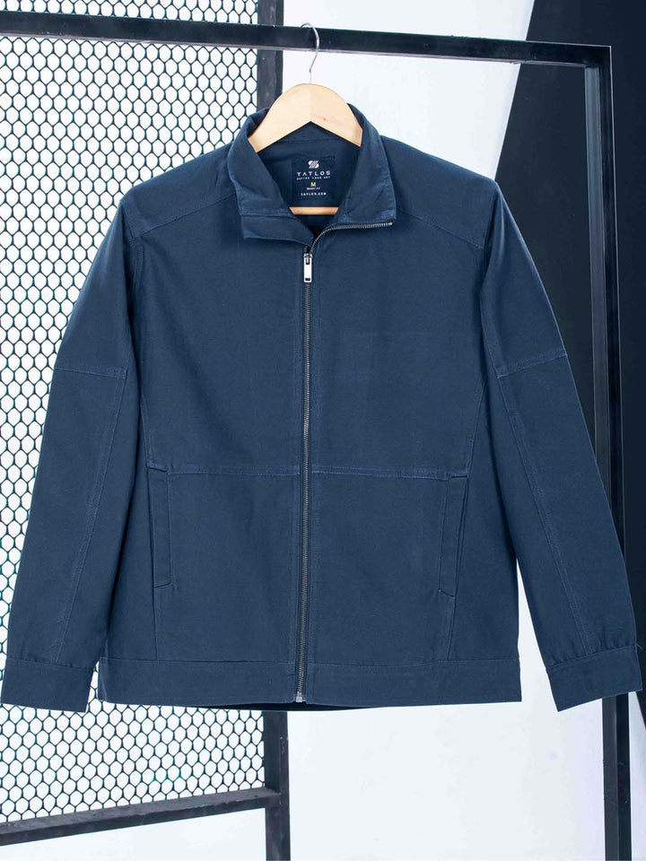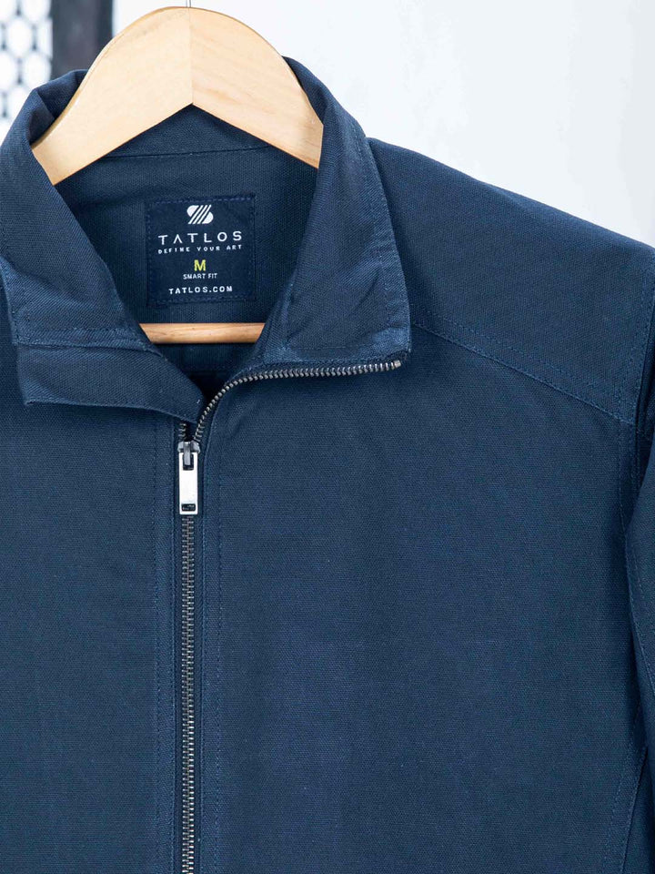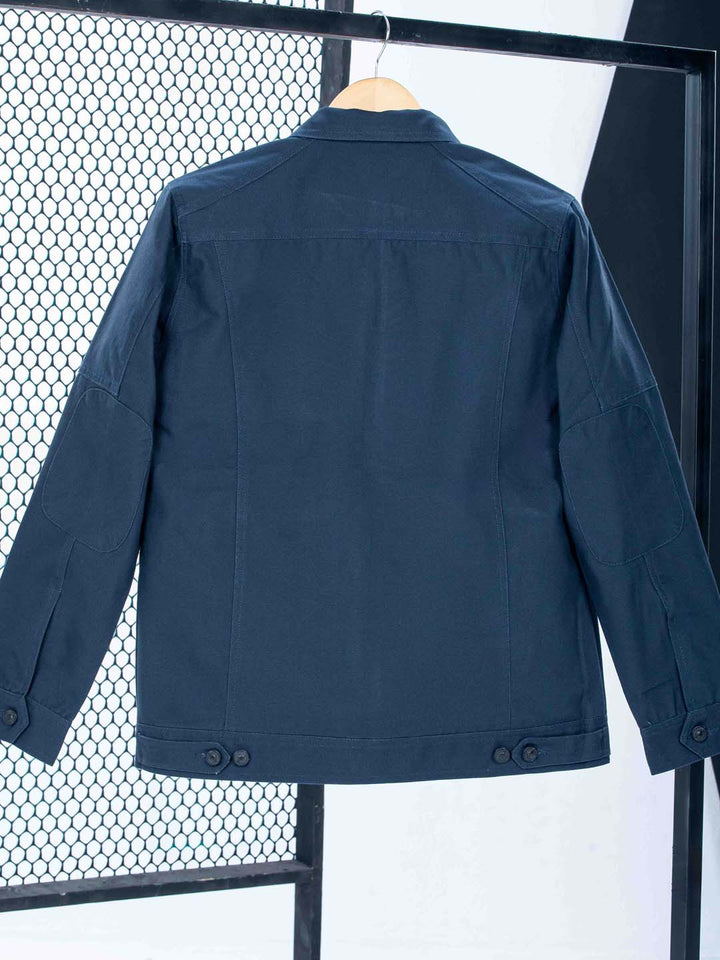 This is a Men's Casual Biker Jacket in a classic Navy Blue. It features a structured shirt collar and a clean front with a full metallic zipper closure. For a refined fit, the jacket includes an adjustable belt detail on the back. Its simple, sleek design makes it a highly versatile staple for casual layering.