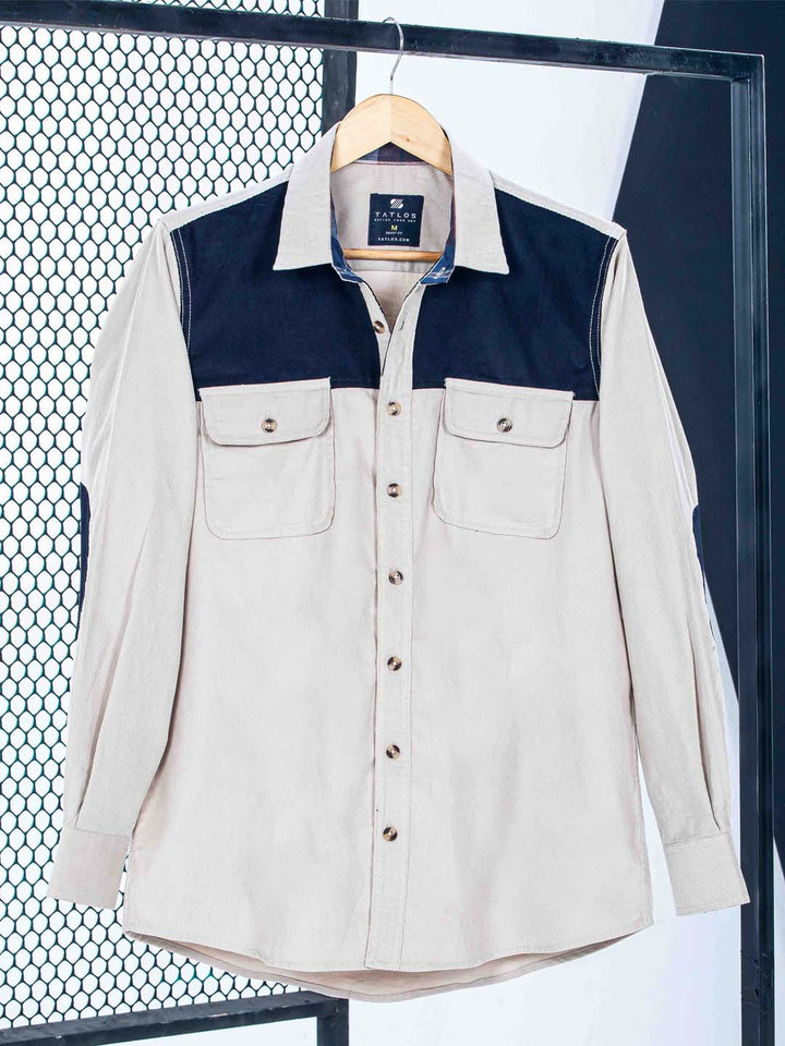 Full sleeve button-down with a crisp cream body and sharp navy shoulder yoke. Ideal for a clean, rugged layered look.