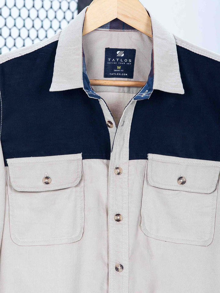 A striking modern take on classic utility wear, this shirt is crafted for both style and durability. It features plush, wide-wale corduroy throughout, showcasing a bold color-blocking design. The main body and sleeves are a crisp Cream/Sand tone, highlighted by a strong Navy Blue yoke across the shoulders.