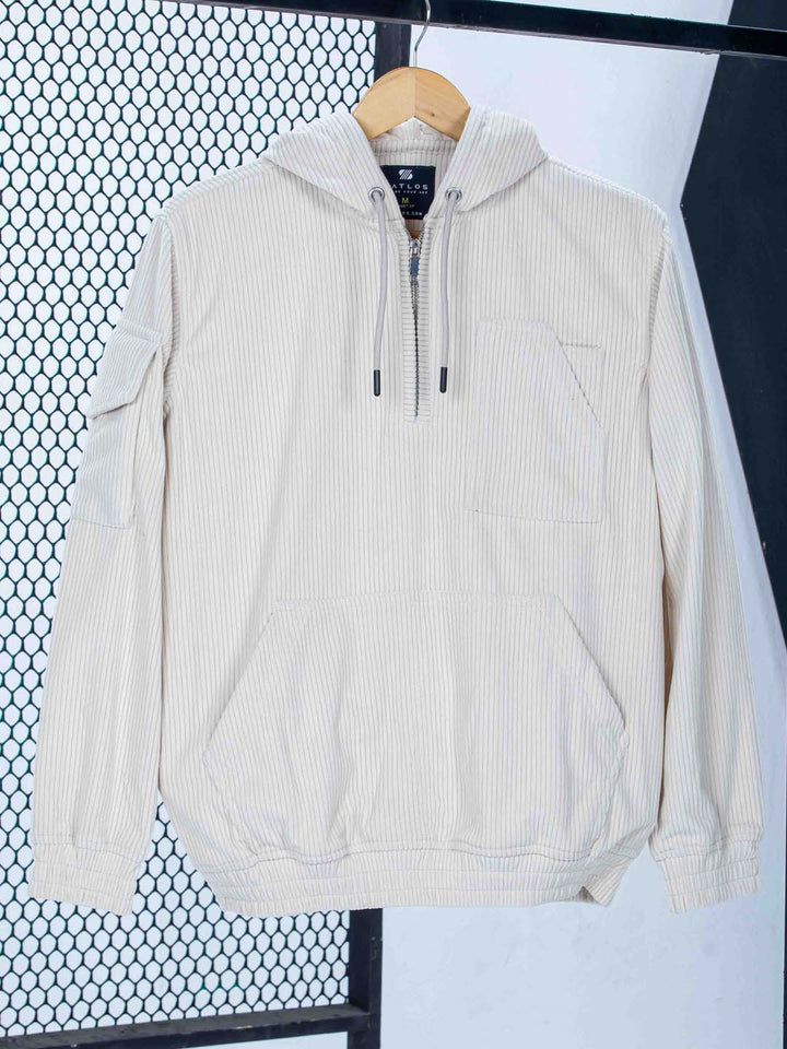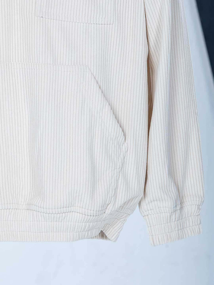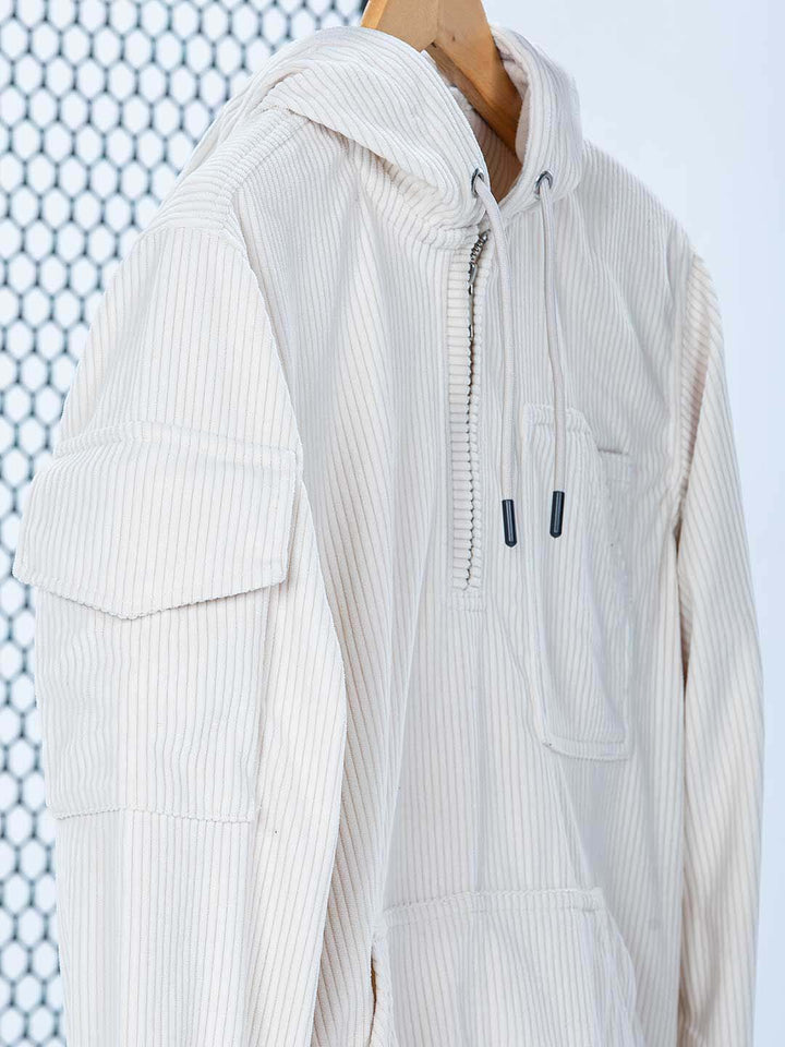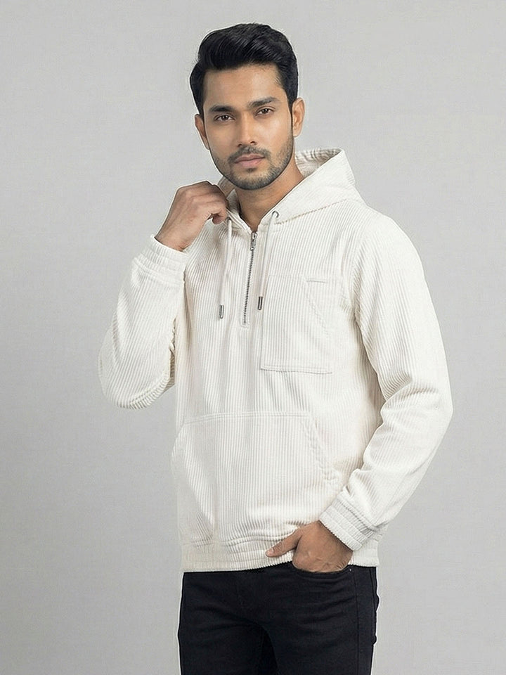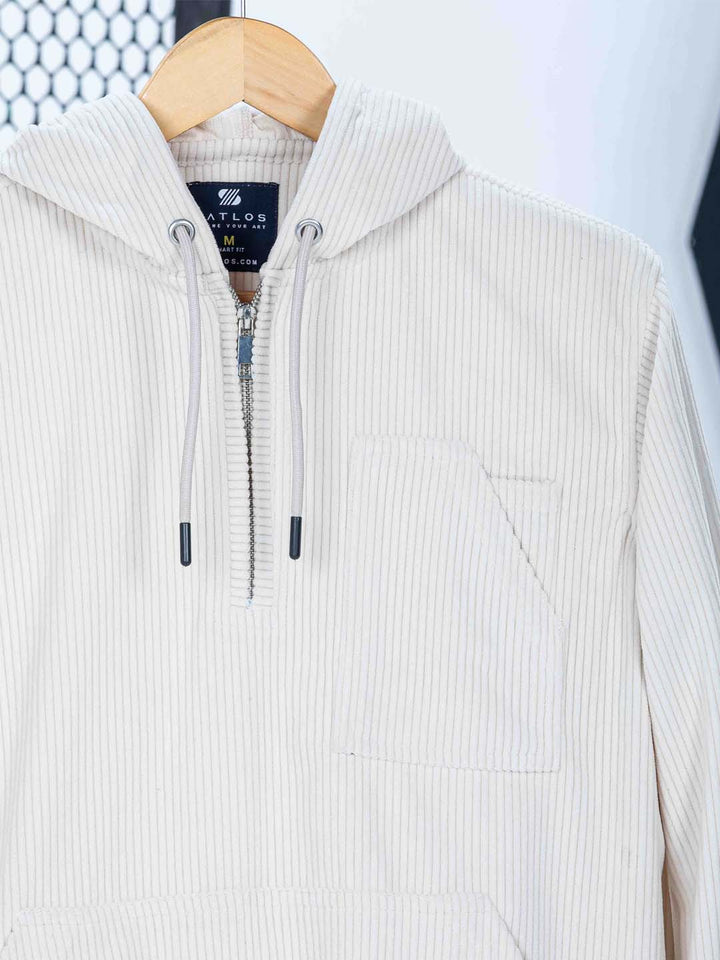 Men's Ethereal Cream Corduroy Hoodie. This casual piece offers a clean, textured look with soft corduroy fabric, a quarter-zip neck, and a unique utility pocket on the sleeve. A modern take on essential layering for everyday comfort.