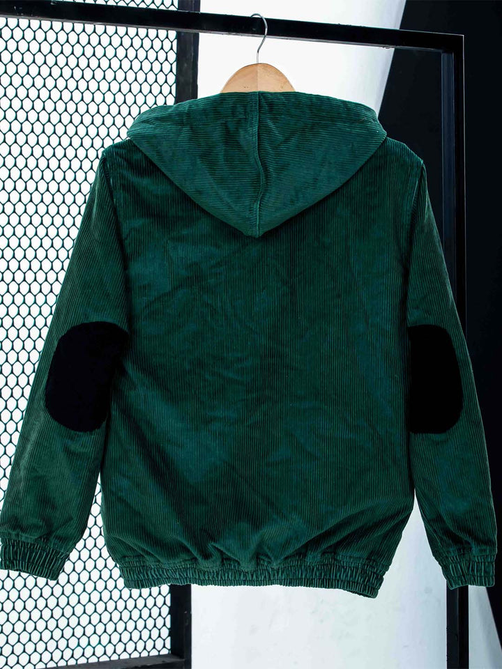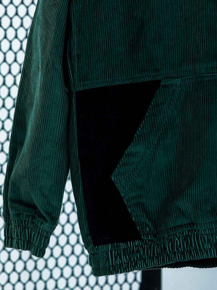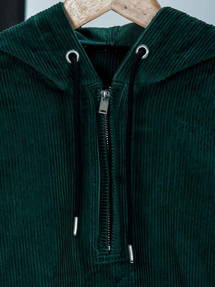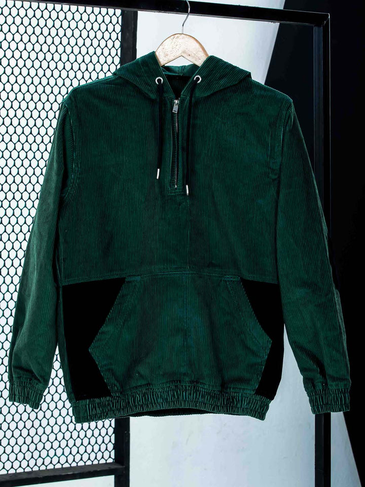 This is a stylish Men's Casual Hoodie in a deep Forest Mist corduroy. It features a modern quarter-zip closure, a drawstring hood, and eye-catching dark contrast paneling on the lower pocket area, blending rich texture with bold utility styling.